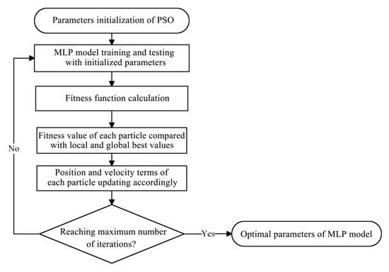 The mini-batch gradient descent algorithm is mainly used to determine the appropriate connection weights between the neurons of MLP. However, several structural parameters, such as the learning rate, learning delay rate, and the learning momentum, are needed for appropriate determination [39]. The learning rate indicates the change range of the weight values between the neurons for each training iteration, and the learning momentum is applied to ensure that the change direction of the weight value is stable. In addition, the number of neurons in the hidden layer has an important effect on the prediction performance of MLP. Thus, it is necessary to select a proper number of neurons in the hidden layer [41]. In this study, the PSO was proposed to determine these four structural parameters of MLP.