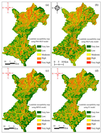 In this study, the landslide susceptibility map generated by the IV model is shown in Figure 6d, for which the landslide susceptibility levels were divided into very low (23.7%), low (22.8%), moderate (26.7%), high (17.2%), and very high (9.2%) levels (Table 2). The raw distribution of landslide susceptibility indices in Shicheng County was very similar to that generated by the PSO-MLP, MLP-only, and BPNN models.