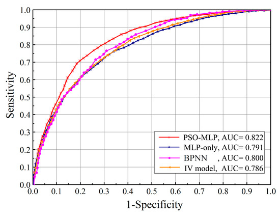 The ROC method has been commonly and successfully applied to landslide susceptibility prediction model evaluation [16,25,26]. An AUC ranging from 0.5 to 1 is the standard index of model prediction performance. The greater the value of the AUC, the better the model prediction performance. Figure 7 shows that the AUC values of the PSO-MLP, MLP-only, BPNN, and IV models were 0.822, 0.791, 0.800, and 0.786, respectively. This precision index once again reflects that the PSO-MLP model had the best prediction performance among these four models.