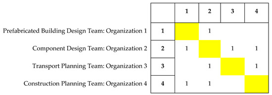 Taking the above prefabricated building project as an example, the case transfer interorganizational workflow was analyzed based on the Sequential Iteration Model. First, the matrix R for the interorganizational workflow correlation shown in Figure 7 and the time matrix were merged into a DSM matrix, M, which is a Sequential Iteration Design Structure Matrix.