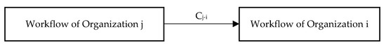 In Reference [30], the concept of workflow merging was described and a systematic method was proposed to merge multiple simple workflows into a single complex workflow. In the present study, the part of the intraorganizational workflow for each organization, which is associated with other organizations, is considered to be a “work set” of the interorganizational workflow. Taking interorganizational workflow processing in the detailed design stage of a prefabricated building project as an example, participating organizations include the designer’s prefabricated building design team (Organization 1), the fabricator’s component design team (Organization 2), the transportation enterprise’s transport planning team (Organization 3), and the construction contractor’s construction planning team (Organization 4) (see Figure 2). In the analysis of the role-based interorganizational workflow, the “work set” of each organization that is associated with other organizations is regarded as a “task,” and the relationships between the interorganizational workflows of different organizations simplify into the relationships between organizations. This simplification is expressed by , i.e., there is a relationship between the workflows of Organization j and that of Organization i. The interorganizational workflow process is equivalent to parallel iteration among different “tasks,” i.e., parallel iteration of “work sets” among organizations. The design results are optimized by repeated iterations.