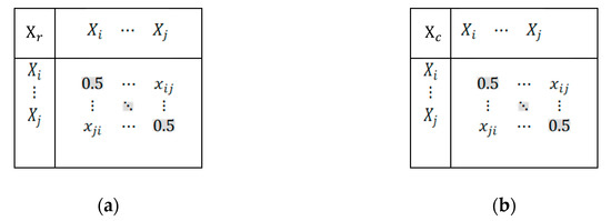 Step 2: The pairwise comparative Fuzzy Consistent Matrix of the probability of change is constructed for the baseline workflow processing of the organization. This method is similar to that in Step 1, except that column comparisons are performed instead of row comparisons, as shown in Figure 5b. Lastly, the NDSM of the probability of change is constructed.