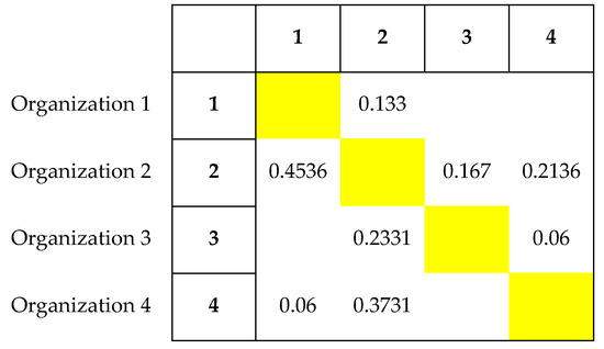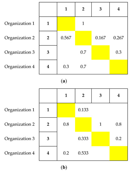 Fuzzy Analytic Hierarchy Process (FAHP) was applied to obtain the numerical Design Structure Matrices (NDSMs) of downstream sensitivity and the probability of change from the BDSM shown in Figure 3. The resulting NDSMs are shown in Figure 6a,b. The product of the elements of the downstream sensitivity and probability of change in NDSMs represents the correlation of the interorganizational workflow. Additionally, the matrix R was obtained, as shown in Figure 7.