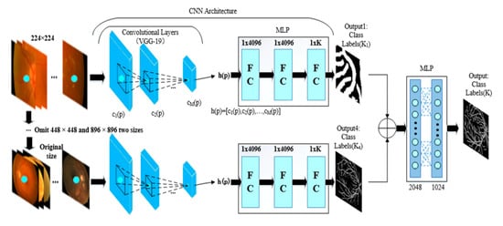 Then we learn a nonlinear predictor, , which is implemented as a multi-layer perception (MLP) defined over hyper-column features. We use an MLP with ReLU activation functions, which can be implemented as a series of “fully-connected” layers. The last layer must have size K, e.g., the class labels or real valued outputs being predicted. This is based on the VGG19 network level but is really deeper than VGG16; thus, to increase the network width, VGG19 is used instead of VGG16 structure. PixelNet is a single-scale input that uses 224 × 224-pixel images for training. This brings great inconvenience. Some large size images are often processed in blocks, while the final result is stitched and integrated; this results in a GPU load that has been increased several times, greatly reducing efficiency. The overall outline of the image cannot be learned since splicing can also lead to edge errors. Inspired by the Unet multiscale network architecture, we apply our improved PixelNet network to multiscale input, e.g., inputting 224 × 224, 448 × 448, 896 × 896 and complete images. In this way, the size of the image and the framework output is no longer limited to 224 × 224. Thus, the Unet network structure becomes a multiscale method. Next, we propose the network structure shown in Figure 1 for multiscale input (blood vessels are taken as an example), and the final output of the blood vessel results are more integrated.