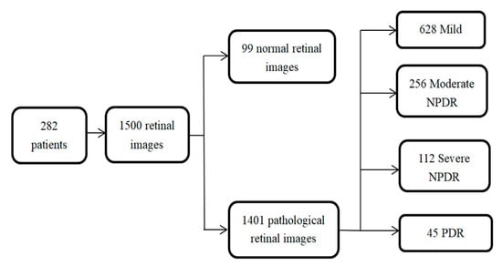 Our comprehensive database contains 1500 retinal fundus images of 283 patients. There are 444 1444 × 1444 images and 940 2124 × 2056 images. The images are from individuals ranging from 25–83 years old for men and 24–75 years old for women. Additionally, each pathological grade is approved by the hospital ophthalmologist. Most of the retinal fundus images are longitudinal, i.e., data contain images for a single patient over a period of time, which makes it easier to analyze the condition later. The structure of the database is shown in Figure 2. In the experiment, we use optimized database to train and test the network segmentation model.