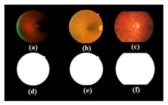 Our database has improved in nature. It is not only a simple expansion of the number of open source databases but also contributes to the simple classification of disease level. The most important goal is to solve the problem of poor quality of some fundus photos, such as retinal images containing dark areas, so that the fundus image can be separated from the background image, as shown in the third column of Figure 1. Therefore, the first step is to segment the retinal image from the background. We grouped image pixels with similar properties by using a k-means clustering method [32] to reduce the number of different colors in the retinal fundus image and perform an adaptive thresholding method to segment the FOV boundary from the background of the retinal fundus image. Since the goal is to distinguish the FOV from the background, the threshold must be greater than the intensity value of the background pixel. However, we need to choose a larger threshold parameter value. The observation is compared by changing the threshold from 0 (corresponding to black) to 30. Initially, FOV segmentation improved as the threshold increased, but only after a certain number of trials (23). Our results show that there was no significant improvement in the segmentation. The FOV boundaries become distorted. This is due to the inclusion of pixels corresponding to the inner region of the FOV. Therefore, we re-set the threshold to 23. Some retinal images and corresponding segmented FOVs are given in Figure 3. Figure 3a–c shows an original retinal fundus image with a dark background area, a full field-of-view circle and a truncated circle. We see that that the proposed method is capable of segmenting the FOV without being affected by the dark areas of the fundus image, as shown in Figure 3d–f. This can also solve the problem of false detection of FOV edges, as shown in Figure 4.