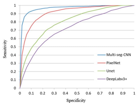 From the Table 1 we know that the higher the accuracy of the input images (image size increases) in the branch, the lower the accuracy of the image. This is because the input image pixel value increases too fast. Figure 5 provides the ROC curve of our multi-seg-CNN.