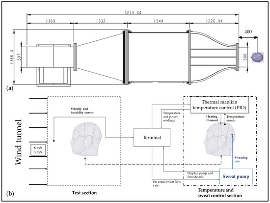 (a) Schematic of open-loop wind tunnel used for simulating tested velocities with thermal manikin; (b) schematic and process flow of convective and evaporative testing.