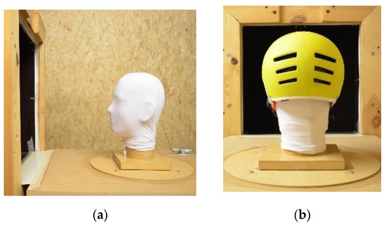 Convective (or dry) heat-transfer testing was done to evaluate the heat-transfer characteristics of selected bicycle helmets for convective heat-transfer mode. Tests were carried out as specified in the test standard [41] except for the temperature setting. The manikin surface was maintained at 30.5 ± 0.5 °C instead of 35 °C, to maintain a temperature difference (∆T) of 10 °C, as done in the previous studies [19,43] as well as to mimic the thermal responses of the human head during cycling [28]. In dry tests, the manikin was covered with a skin suit (Figure 3). The skin suit covering the head was made from 80% polyamide and 20% Lycra. The dry conditions were simulated by maintaining the environmental temperature at 20.5 ± 0.5 °C. For every test set, heat loss from the nude manikin was measured and used in the calculation of heat fluxes and thermal resistance.