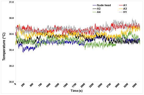 The surface temperature of the manikin zones measured using temperature sensors during the entire test duration is plotted in Figure 4. Head-surface temperature reached a steady state approximately 20 min after the start, after which temperature was in the range of 30.5 °C, with a standard deviation of ± 0.5°C for the remaining duration of the test.