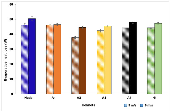 Heat losses registered by the manikin with and without helmets during the combined convective-evaporative tests at 3 m/s and 6 m/s are shown in Figure 7. Apparent evaporative heat loss was in the range of 37.8–47.4 W at 3 m/s and 44.6–50.5 W at 6 m/s (Table 4). From the test results, it is evident that convection combined with evaporation results in 51–54% higher heat transfer than pure convection demonstrating the importance of evaporation mode in heat transfer between head and helmet. The apparent evaporative heat flux value recorded in this study for nude head at 3 m/s is comparable to that reported in this study [27]. A comparison of cooling efficiency of helmets (Table 4) indicated that, at 3 m/s, helmet A1 recorded the highest (97.3%) and helmet A2 recorded the lowest (79.8%). At 6 m/s, helmet A4 recorded the highest (96.7%) and helmet A2 recorded the lowest (89.9%). Furthermore, a global analysis on the total heat flux values was carried out using two-way ANOVA that showed, in comparison with the nude head, Helmets A1, A4, and H1 were statistically not different (p > 0.05). However, as indicated in this study [31], classification based on overall heat transfer is not sufficient and, hence, zonal heat-transfer characteristics were also studied.