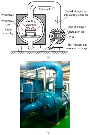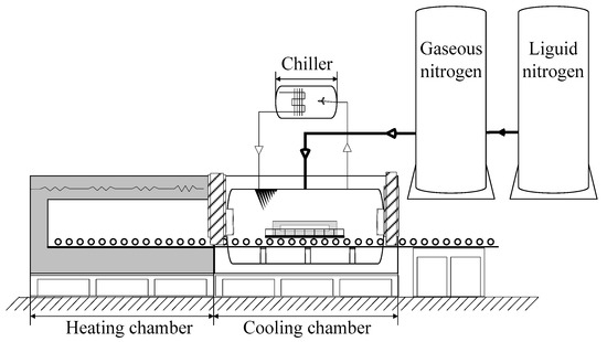 Figure 2 shows the nitrogen cooling system developed in this study. The gaseous nitrogen, which was transported via a specially-designed nozzle of the cryogenic liquid nitrogen tank, is passed into the cooling chamber. As the surge tank with a volume of 15,000 L was filled with nitrogen under a pressure of 8.0 bar, nitrogen could be rapidly filled in the cooling zone. In this study, the cooling chamber was controlled to be filled with nitrogen at a pressure of 5 bar. This nitrogen gas exchanged heat with the workpieces it contacted, resulting in an accelerated cool-down. Cooling of the workpiece resulted from the forced convective heat transfer between the workpiece surface and nitrogen.