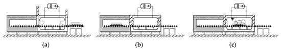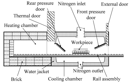 As the environmental conditions of the heating and cooling zones must be precisely controlled, the door between the heating and cooling zones as well as the external door is specially designed to prevent leakage [45]. Figure 5 shows the developed door system for the high-quality process cooling. A roller-type moving system is designed to enable faster movement of the workpiece. The time to move the workpiece from the heating chamber to cooling chamber is less than 15 s.