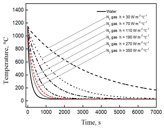 The element type was an eight-node heat transfer brick element (DC3D8). As thermal properties of THA, ρ = 18,500 kg m−3, k = 125 W m−1 °C−1, and Cp = 133 J kg−1 °C−1 were used in this study. During the cooling process, the heat was removed using three main heat transfer mechanisms, i.e., convection, conduction, and radiation. Varied film coefficients were applied at the surface of specimen for cooling with water and nitrogen gas. A heat transfer coefficient (h) value of 580 W m−2 °C−1 was used for water [46,47] and h = 30, 70, 110, 190, 270, and 350 W m−2 °C−1 were used as heat transfer coefficients for the nitrogen gas, because the heat transfer coefficient of nitrogen gas varies according to pressure and temperature [2,48]. The initial temperature of the specimen was set to 1150 °C, and the ambient temperature was set to 27 °C. The temperature at the surface of the specimen was obtained, as shown in Figure 9. Figure 10 shows the simulated cooling curves across different heat transfer coefficients. As expected, the cooling rate of water cooling is observed to be higher than that of nitrogen cooling. It is also observed that the cooling rate increases with increasing heat transfer coefficient for nitrogen gas cooling. At the cooling completion time of 2000 s, the heat transfer coefficient of the developed nitrogen cooling system is observed to be approximately 270 W m−2 °C−1, because the time to attain the room temperature at this value is similar with that of Figure 8. As the heat transfer coefficient of nitrogen in the atmospheric pressure is in the range of 30–50 W m−2 °C−1, it can be observed that it is significantly elevated due to the developed cooling system that performs a high-speed circulation under high pressure.