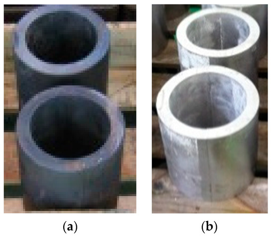 To analyze the cooling process that employed water and nitrogen gas, the tubular workpiece was modeled with an element dimension of 0.02 mm × 0.02 mm × 0.02 mm, as shown in Figure 9. The Di, Do, and L of the tubular model are 0.4 m, 0.6 m, and 0.5 m, respectively.