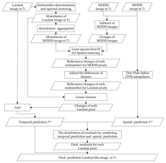 can be obtained from Equations (5)–(9) in this study. However, the of FSDAF were calculated by assigning the temporal changes of MODIS images to Landsat images without considering the differences of Landsat and MODIS images.