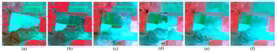 Zoomed in scenes of the black square areas marked in Figure 4. From left to right, (a) true Landsat image of 5 July 2004(base date); (b) true Landsat image of 6 August 2004(prediction date); (c–f) predicted images of 6 August 2004 by STARFM, STRUM, FSDAF and EFSDAF, respectively.