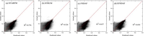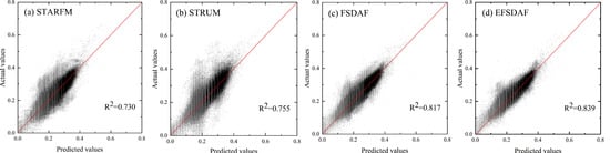 Scatter plots of the true values and the predicted values for NIR band in dataset 2. From left to right, (a–d) the scatter plots for STARFM, STRUM, FSDAF and EFSDAF, respectively.