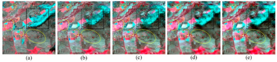 Visual comparison of Landsat-like images predicted by STARFM, STRUM, FSDAF, and EFSDAF in dataset 2 (flood). From left to right, green-red-NIR (standard false color) composites of (a) true Landsat image of 12 December 2004; (b–e) predicted images of 12 December 2004 by STARFM, STRUM, FSDAF, and EFSDAF, respectively. (Figure 7 presents the predicted Landsat-like images of 12 December 2004 by four fusion methods in the abrupt change area, and the yellow elliptical circles of Figure 7 represent the differences of the four fusion methods. The zoom-in black square areas marked in Figure 7 are used to more clearly compare the fusion results by the four methods in the land cover change area (Figure 8)).