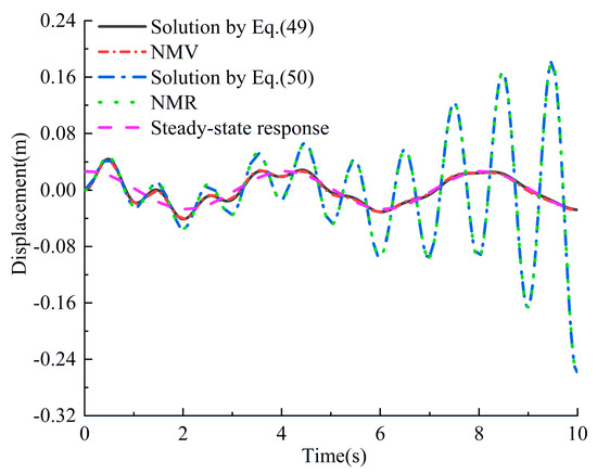 The numerical results of NMV are the total response which includes transient vibration and steady-state vibration. The transient response will decay exponentially with time, and only the steady-state vibration will remain. However, the peak displacement of the correct theoretical solution by Equation (49) is about 1.6 times than that of steady-state response at the initial stage. Since the solution in the frequency domain is only the steady-state vibration, it represents that neglecting the effects of transient response would lead to unreliable results in engineering design.