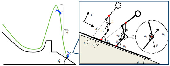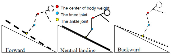 From the motions observed during landing, a mechanical model of the landing phase was established in the X and Y directions, as shown in Figure 1. The angle between the femur and tibia was defined as α. The angle between the tibia and the slope of the landing plane was defined as β. The angle between the trunk and the landing slope was defined as γ. G and G‘ represented force due to gravity and force on the tibial plateau, respectively. By combining theory with research [15,16] G’ was calculated as: