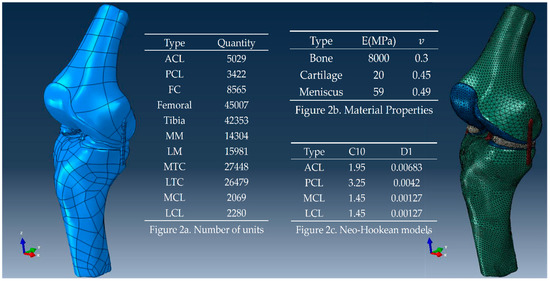The 3D models obtained by 3D reconstruction were imported into Abaqus software in IGES format with the results of meshing (Figure 2a, using C3D10 meshing classification), attributes of materials and the assembled model displayed in Figure 2. The finite element calculations were completed using constraint conditions which were also configured in Abaqus, and then the density, elastic modulus and Poisson’s ratio of bone, cartilage, and meniscus were set according to the data in Figure 2b [18,19,20,21]. An incompressible Neo-Hooke hyperelastic model was selected for the ligament model, expressed by C10 and D1 coefficients, as shown in Figure 2c [22]. The constraint conditions of the knee FEM were set according to the anatomical characteristics. All the contacts between ligaments and bones were “Tie” type constraint and tibia was set as “ENCASTRE”.