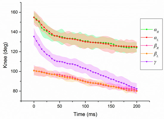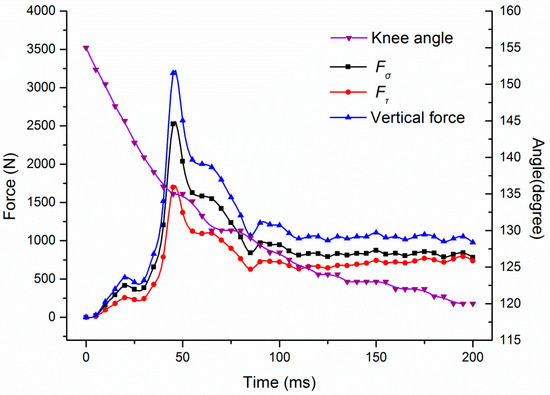 α, β, and γ are the principal parameters for the mechanical model, with takeoff velocity (v) and landing balancing duration (t) critical variables for dynamic analysis. By adding results of tests using a force platform in the laboratory [23], vertical and shear force curves of the landing slope and tibial plateau were fitted by dynamic analysis, as shown in Figure 6. The balancing phase was 0–200 ms, maximum vertical force and shear force on a single knee tibial plateau were approximately 2527 and 1699, respectively, with the range of knee angles from 155 to 120 degrees. Peak force was experienced at approximately 135°.