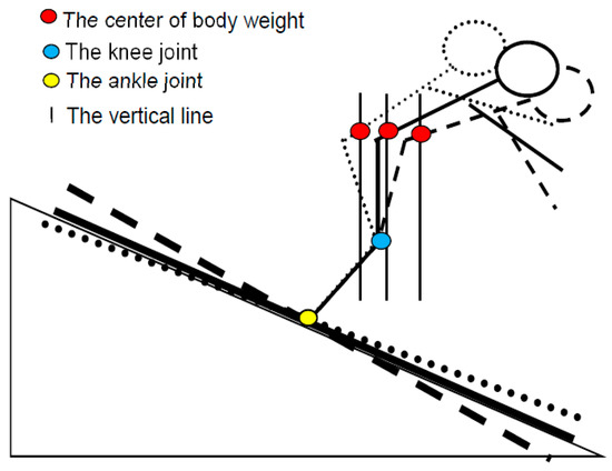 More apparent differences can be observed if the three are combined into one image. An integrated image can be obtained when the center points of the knee and ankle joints from the three are overlain, as shown in Figure 5. Vertical lines from the center of body weight demonstrate the different positional features. In forward landing, this line is forward of the knee joint, essentially located within the boundaries of the knee joint in neutral landing and behind the knee joint in backward landing.