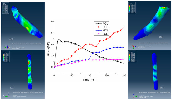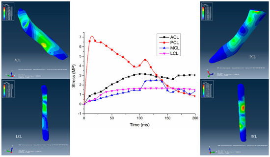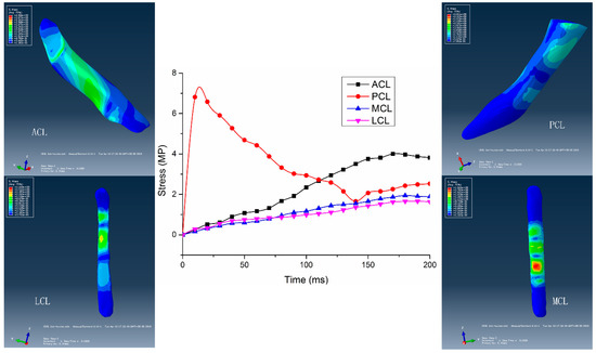Combined with the three landing conditions described in Section 3.1, the external constraint conditions of the model were adjusted and finite element analysis performed on the ACL, PCL, MCL, and LCL. Time–stress curves were calculated according to the results of the analysis.