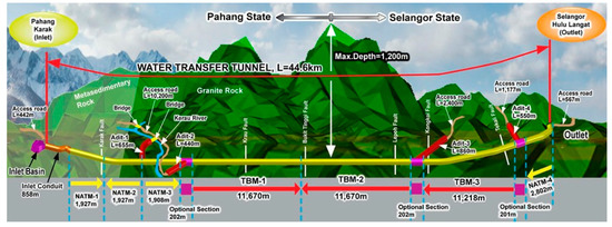 A tunnel project (PSRWT, Pahang–Selangor raw water transfer) with a total length of 44.6 km and a diameter of 5.23 m was planned and constructed in Malaysia. This tunnel aims to transfer water from Pahang state to Selangor state. PSRWT tunnel was excavated in a mountain area of Peninsular Malaysia, where six major faults were observed with an elevation range from 100 to 1200 m. In the field, rock strength is poor in areas of fault intersections and highly to moderately weathered zones were observed along the tunnel. Different rock types including shale, coarse-grained granite, and medium-grained granite were observed in various tunnel distances (TDs) of PSRWT tunnel. Regarding construction techniques for the tunnel excavation, there were seven parts, comprising four parts of NATM and three parts of TBM. In PSRWT tunnel project, 11,761 m in the mixed ground, 11,761 m in very hard ground and 11,218 m in the blocky ground were excavated by three TBMs. Construction`s of PSRWT tunnel with their maximum overburden are shown in Figure 1.