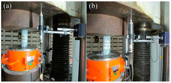 Uniaxial compressive strength (UCS) test conducted on a sample of TBM 2, tunnel distance = 9300 m, (a) before failure, (b) after failure.