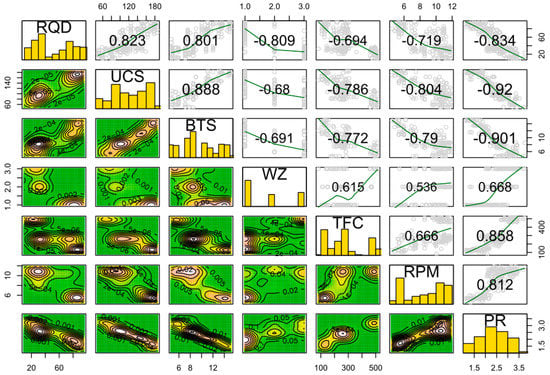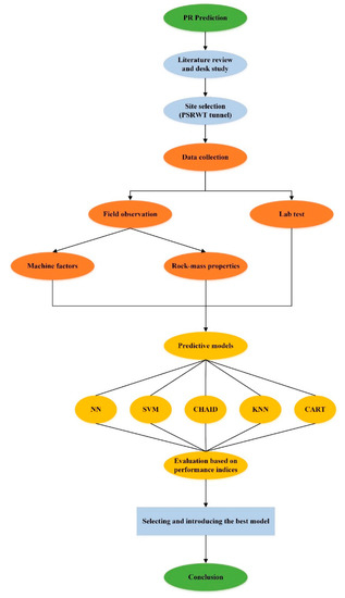 In this study, based on the literature review, available field observations, and laboratory tests, six parameters, UCS, BTS, RQD, WZ, TF, and RPM, were selected as model inputs to estimate TBM PR. It is important to mention that RQD was calculated based on the method suggested by Bieniawski [93]. Note that value was assigned to each WZ in the used datasets, i.e., 1, 2, and 3 were assigned to fresh, slightly weathered, and moderately weathered, respectively. Table 3 presents a basic statistical description of the experimental database applied in the current research. For more information regarding the data used in this study, the correlation matrix of input and output variables for all 209 cases is shown in Figure 4. High negative or positive values of the correlation coefficient between the input variables may result in poor efficiency of the methods and a difficulty in construing the effects of the expository variables on the response. As can be seen in Figure 4, there are no significant correlations between the independent input variables. Additionally, a detailed flowchart of this study for the prediction of TBM PR is presented in Figure 5. According to this flowchart, after literature review and site selection, data collection is divided into two sections of laboratory tests and field observation. Therefore, all influential parameters on TBM performance are recorded and considered as model inputs. To predict TBM PR, SVM, KNN, CHAID, NN, and CART are applied and developed. Then, an evaluation will be performed for each model and the best one among them will be selected and introduced as the best predictive model. In the following sections, the modeling process of ML techniques for the PR estimation and their evaluations based on performance indices will be explained.