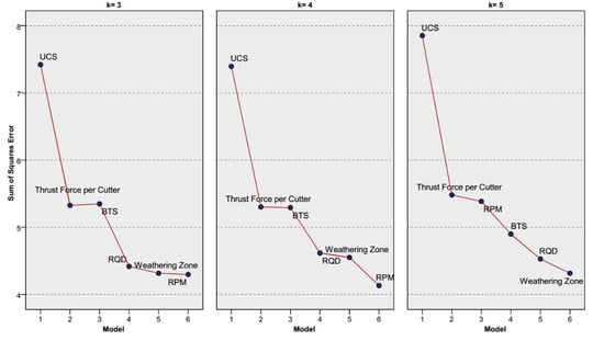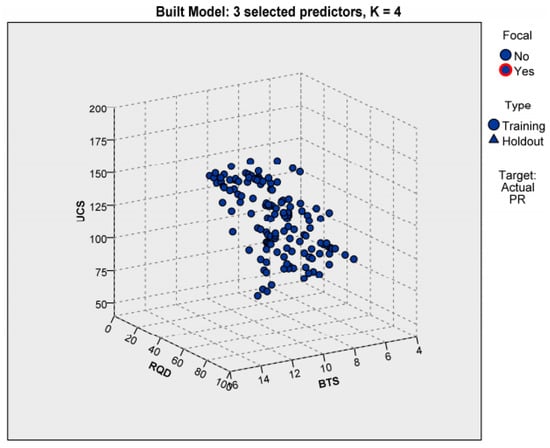 As mentioned in the previous section, KNN has been selected as the best predictive model of TBM PR. Figure 6 and Figure 7 show the suggested structure of the KNN predictive model in predicting PR of TBM. In the development of the k-NN model, the objective of performing the model was to establish the balance between speed and accuracy. Therefore, the model automatically selected the best number of neighbors, within a small range. In the present study, we used k number between the values 3–5 by implementing a trial-and-error method of the system. Figure 6 presents the predictor space chart of the KNN model. In this figure, the predictor space gave excellent results, using the three input variables of UCS, RQD, and BTS as predictors for predicting the PR. The predictor space chart is an interactive graph of the predictor space and is directly printed out from the software. Any dot can temporarily become a focal record if selected. “Focal records” are simply points selected in the predictor space chart. If a focal record variable is specified, the points representing the focal records will initially be selected and becomes red. Figure 7 shows the relationship between the predictors and K selection. In the horizontal axis of the chart, the numbers of the nearest neighbor are presented. Sums of square errors are shown in the vertical axis. As shown by the figure, the errors for k = 3, 4, and 5 were determined as 7.41, 7.39, and 7.85, respectively. The results reveal that k = 4 is the best value of the nearest neighbor numbers for the developed k-NN model.