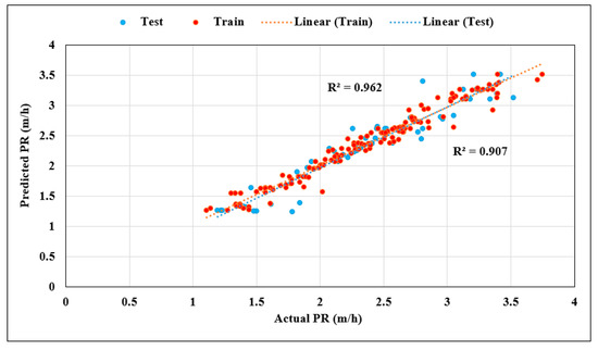 Predicted PR values by KNN, along with their actual values for training and testing datasets, are displayed in Figure 8. The R2 between predicted and actual PR in training and testing dataset were 0.962 and 0.907, respectively. Besides, an RMSE of (0.204 and 0.116), a VAF of (89.574% and 96.226%) and an MAE of (0.157 and 0.081) were obtained for testing and training datasets of the best predictive model of this study, respectively. These results show that KNN, as a newly developed model in the field of TBM performance, can provide higher prediction performance compared to other predictive models. It is worth mentioning that CHAID (as a tree-based model) was also implemented for the first time in this field with the obtained R2 values of 0.850 and 0.934, for testing and training datasets, respectively, which showed an enhanced performance of this model in solving TBM performance. Compared to other published studies related to the same tunnel [12,13,38], this study has a different database with a slightly higher prediction performance. For example, in terms of R2, values of (0.897 and 0.905) and (0.919 and 0.912) were obtained by PSO-ANN and ICA-ANN techniques, respectively in the study conducted by Armaghani et al. [12]. In another study, Koopialipoor et al. [13] developed the group method of data handling technique to solve TBM PR. They obtained R2 results of 0.946 and 0.924 for training and testing datasets, respectively. A GEP model was developed by Armaghani et al. [38] to predict TBM PR, with R2 values of 0.855 and 0.829 for training and testing datasets, respectively. Based on the above discussion, the developed KNN model in this study can provide higher prediction capacity compared to previously published studies.