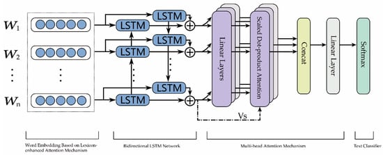 Although the word embedding module based on lexicon-enhanced attention mechanism can solve the problem of word-level semantic confusion to some extent with the help of the interactive learning of attention mechanism, the generated text representation is insufficient for text sentiment analysis. Hence, we introduce a multi-head attention mechanism into the deep neural network to capture the important contextual information from different representation subspaces at different positions. And the network structure is mainly composed of the bidirectional LSTM network and the multi-head attention mechanism as shown in Figure 1.