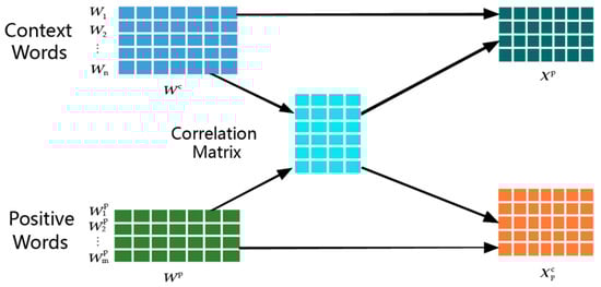 where represents the positive-sentiment resource word representation matrix associated with the context words. The illustration of sentiment-context word correlation is shown in Figure 2. For the computational complexity, it can be seen from Figure 2 that the correlation matrix is calculated by one-way multiplication action. Hence, the complexity of is proportional to the dimension of the corresponding matrixes, which can be expressed as . Similarly, the complexity of and is based on the one-way multiplication action of , i.e., .