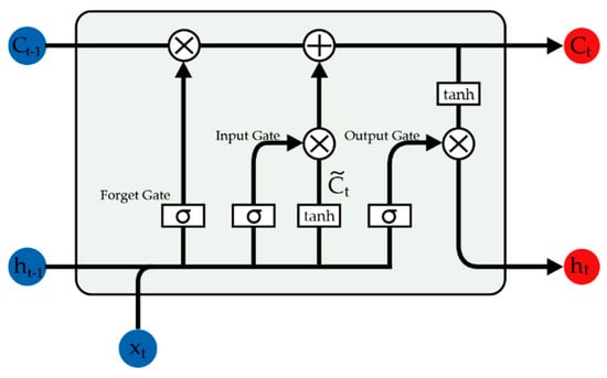 where is the sigmoid function, denotes the element-wise multiplication, , , , and are the learnable weight matrixes for their corresponding gated units and the intermediate cell, respectively, while , , , and are their corresponding bias vectors. Following the same procedure of the forward network, the backward network can generate a corresponding hidden state vector . The detailed structure of the basic LSTM unit can be seen from Figure 3.