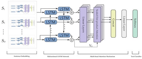 Following the same procedure of the multi-head attention mechanism as described in Section 3.3, we apply the multi-head attention mechanism to encode hidden states of the sentence sequence from different representation subspaces at different positions. The final document representation can be computed as: