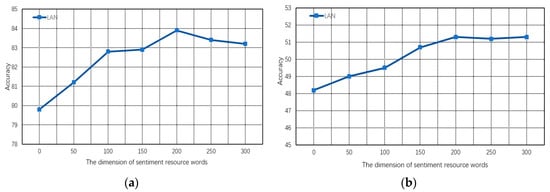 Classification accuracy of the proposed LAN model on two sentence-level sentiment classification datasets. (a) MR; (b) SST. When the dimension of sentiment resource words is equal to 0, it means that the lexicon-enhanced attention mechanism is not equipped with the word embedding module.