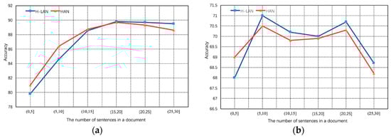 From Figure 6a, we can observe that the accuracy of these two models presents a sharp upward trend when the number of sentences changes from (0, 5] to (15, 20]. As documents with the sentence number from (15, 20] to (25, 30], both models show a stable descending trend on IMDB dataset. The main reason for this result is that, fewer sentences usually contain less valuable information contributing to the orientation of sentiment analysis and documents with a large number of sentences contain more complex correlation between sentences so that it is difficult to learn a high-quality document representation from large-scale unstructured text. In particular, compared with HAN, our H-LAN model has a relatively small improvement when the number of sentences exceeds 20, which potentially demonstrates that H-LAN has a robust receptive field on the text sequences. As shown in Figure 6b, it is interesting to find the similar uptrend until the number of sentences arrives at (5, 10]. However, the trends in the accuracy rate of all discussed models show a significant fluctuation when performing on documents with sentence number from (5, 10] to (20, 25]. The reason is that too long documents contain too many noisy words, so that it can greatly mislead the prediction of fine-grained text sentiment classification. After that, H-LAN and HAN present a steady downward trend in terms of accuracy before the number of sentences reaches (25, 30]. Specifically, comparing with H-LAN and HAN, it can be observed that H-LAN improves the accuracy of HAN by a large margin. This strongly proves that our H-LAN model has a powerful receptive ability to alleviate the impact of gradient vanishing [] caused by the architecture of recurrent neural network. To sum up the above observation, we can conclude that the proposed H-LAN can effectively retain the semantic structure of the raw document to improve the performance of sentiment analysis.