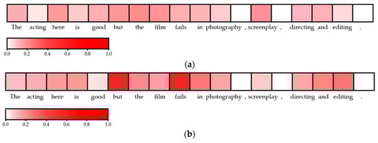 Visualization of sentence representation learned by the word embedding module of our LAN model. (a) initial attention visualization result; (b) Final attention visualization result. The attention score used for color-coding is calculated by Equation (7). The depth of color represents the importance degree of a word to the sentiment polarity of a sentence.