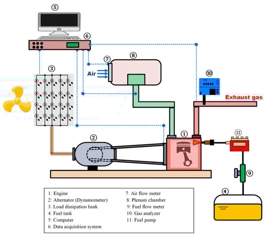 A single-cylinder compression ignition (CI) naturally aspirated engine (Figure 1, Table 3) was used to carry out the tests. A diaphragm pump mounted in the crankcase was used to deliver high-pressure fuel to the injector, which was located at the center of the hemispherical bowl-in-piston combustion chamber. The mass flowrate of air draw during the intake process was measured via a differential pressure transducer mounted at the entrance of a plenum cylinder used to attenuate the pulsation of the intake process. The fuel mass flow rate was measured using a burette mounted in the pipe connecting the fuel tank to the fuel pump. The engine was loaded by a dynamometer—a car alternator modified for the purpose—with the load governed by a bridge rectification circuit that managed the external excitation and dissipated generated heat using an air-cooled resistive load bank. The rotational speed of the engine was sensed using a proximity switch, and an exhaust gas analyzer (EMS 5003) (Table 4) was used to measure the engine tailpipe emissions of CO2, CO, NOx, and HC.