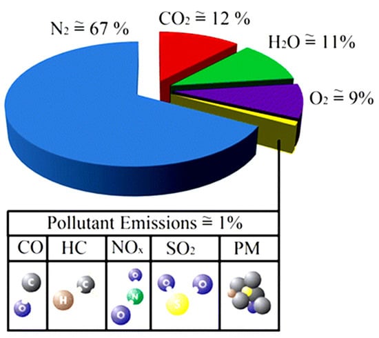 This study analyzed the combustion and emissions of the DSO biodiesel blends and the base diesel fuel. The typical volumetric makeup of the exhaust gas emissions from a diesel engine are shown in Figure 2 []. It is seen from the figure that the volumetric concentration of the pollutant emissions is typically less than 1%.
