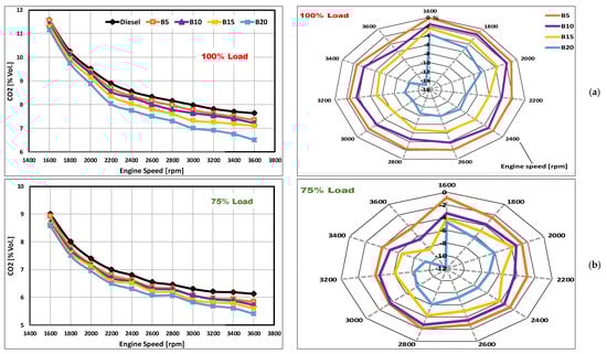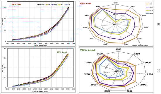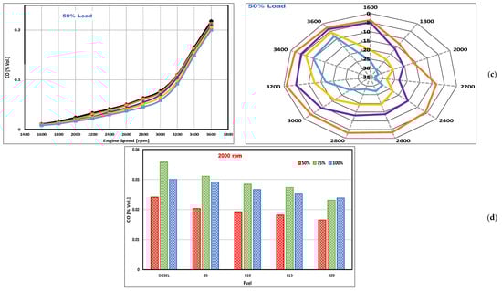 Figure 3 shows the variations in CO2 emissions by the respective fuels at different speeds and loads. In all of the blends and the benchmark diesel fuel, CO2 emissions decrease as the engine load decreases or the engine speed increases. Running the engine under a partial loading reduces the amount of fuel delivered to the cylinder and, ultimately, the CO2 produced by the combustion. This interpretation ties into the clear and worthy goal of reducing engine CO2 emissions through the efficient use of combustion energy, i.e., converting the combustion energy into kinetic energy without waste. To achieve this, the losses in the various engine accessories can be minimized, kinetic and heat energy losses can be recovered, and the air resistance and drag from the motion of the car can be reduced. The average CO2 emissions of diesel fuel over the entire speed range was reduced from 8.76 vol.% under full loading to 6.9 and then 4.6 vol.% under 75 and 50% loading, respectively. The average CO2 emissions of B20 at 100, 75, and 50% loading were 7.9, 6.4, and 4.2% vol., respectively. When the engine ran at higher speeds, very brief time intervals were available for the intake process, resulting in a reduced intake of fresh air, which in turn diminished volumetric efficiency and, therefore, the CO2 emissions in the engine exhaust [,]. The presence of inherent oxygen in the DSO biodiesel offset some of this oxygen shortage within the combustion chamber. Thus, a reduction of 37% in the CO2 emission of B15 at full loading was observed, compared to the 34.1% observed for the base diesel fuel, when the engine speed was increased from 1600 to 3600 rpm. For the same increase in engine speed and 50% engine loading, the corresponding decreases were 47.4 and 44.7%, respectively. It appears that, at lower engine loads, the variation in CO2 emission became more sensitive to the increase in engine speed, which is the result of a combination of two effects that reduced both the carbon and oxygen levels in the cylinder. The inclusion of DSO biodiesel in the blends reduced the CO2 emissions in proportion to the biodiesel fraction: At full loading, the average reductions in CO2 emissions over the engine speed range were 2, 3.4, 5.7, and 9.6% for B5, B10, B15, and B20, respectively. This variation can be better understood by taking a closer look at the combustion chemistries of the respective DSO biodiesel (C16H36O2) species. The general stoichiometric combustion reaction can be expressed as: