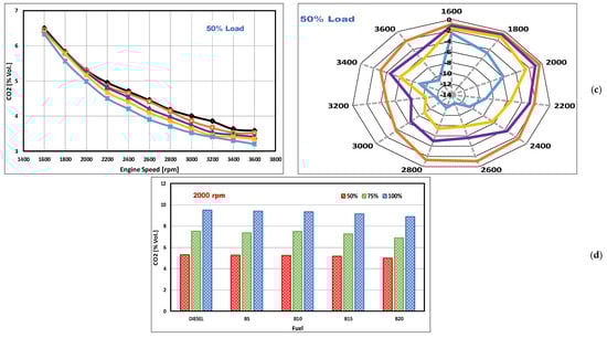 CO2 variations with engine speed and load, presented as trends (left) and the normalized value contours (right) for (a) 100%, (b) 75%, and (c) 50% loading. (d) Comparison of the results for all fuels at all loads at 2000 rpm.