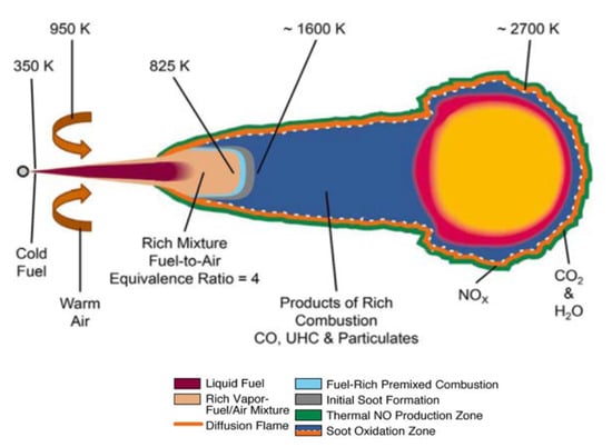 Schematic of a typical stabilized combustion jet in a diesel engine [].