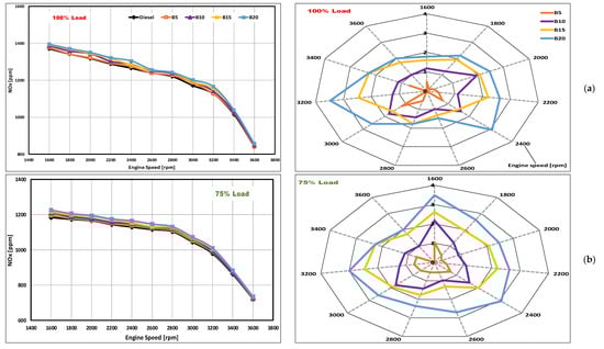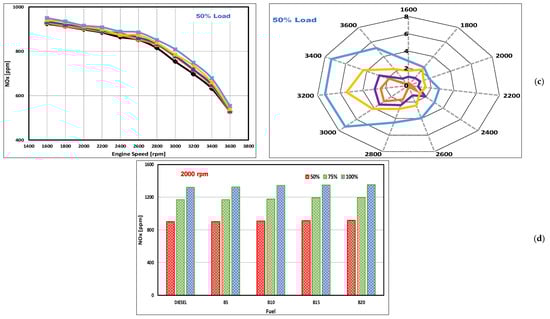 The nitrogen oxide (NOx) emissions pattern produced by DSO biodiesel blends and fossil-based diesel are shown in Figure 6. As in the CO2 and CO cases, the tests were conducted at different engine speeds and loads. Nitric monoxide (NO) and nitric dioxide (NO2) are collectively referred to as NOx, with NO representing the preponderant oxide (in diesel engine emissions, the proportion of NO2 within NOx is 10–30%) []. As very small concentrations of NOx are emitted from a diesel engine relative to the aggregate exhaust emissions, the concentration of NOx is expressed as parts per million (ppm). On-board ICEs contribute more than 50% of the NOx that is emitted globally [].