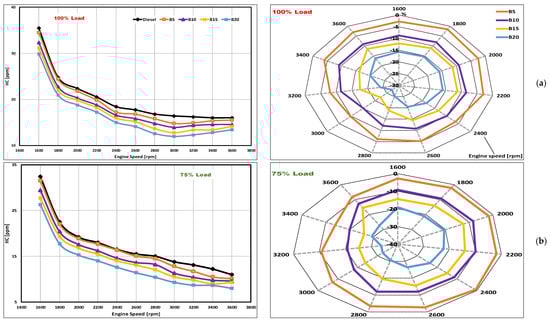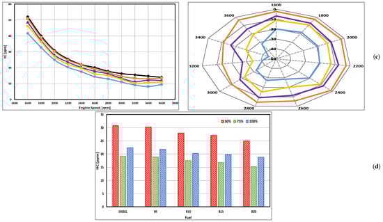 Blending the neat fossil diesel with fractions from DSO biodiesel appears to also have had a significant impact on the HC emissions. As shown in Figure 7, increasing the amount of DSO biodiesel in the blend reduced HC emissions to a degree proportional to the DSO biodiesel fraction []. These substantial changes in emissions can be attributed to the variations in the ignition delay occurring as a result of blending the fossil-based diesel with the DSO biodiesel. It is worth mentioning that, in this context, the ignition delay was both a chemical and physical process. That is, it was driven by both the heterogeneous and the complex physical mixing process in the CI engine and the chemical kinetics of the fuel. All blends demonstrated considerable declines in HC emissions relative to neat fossil diesel throughout the running process, possibly because the higher CN content of the DSO biodiesels shortened the ignition delay and therefore decreased the fuel fraction that could be diluted by the surrounding air prior to ignition. As a result, the pre-mixed combustion phase was minimized, and less fuel had was dispersed within the cylinder prior to combustion. This reduction in ignition delay also constrained the amount of fuel that could impinge on the cylinder walls, a potential source of HC emissions. The best performance in terms of the maximum decrease in HC emissions relative to the benchmark diesel were attained at the mid-range of engine speed, with peak reductions of 13.9, 27.2, 34, and 44.4% at loads of 75, 100, 100, and 100% for B5, B10, B15, and B20, respectively. Further increases in the engine speed diminished these reductions and caused the HC emissions of the DSO blends to converge with that of the neat diesel. At the mid-range of engine speeds, the oxygen bound within the biodiesel fuels improved the combustion process, and the DSO biodiesel blends could meet acceptable levels of fuel atomization and homogeneous charge distribution within the combustion chamber. At higher engine speeds, however, extremely brief time intervals were available for any combustion event, including fuel atomization, evaporation, and distribution within the cylinder. The higher viscosities of the DSO biodiesel blends worsened the situation, leading to poor combustion efficiency. Eventually, the elevated HC emission levels approached that of neat fossil diesel, with the relative reductions for B5, B10, B15, and B20 reducing to 3.5, 14.2, 21.4, and 32%, respectively, at 50% load and 3600 rpm.
