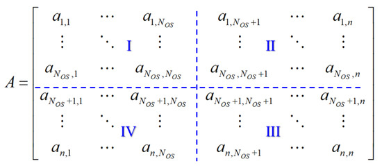 where n is the number of nodes in G, which is the sum of the number of substations NOS and the number of wind turbines NWT in the wind farm. As shown in Figure 1, the adjacency matrix A is an asymmetric matrix, forming four sub-regions, of which Area I represents the connection relationship between substations. Area II describes the connection relationship of the substations to the wind turbines. Since the substations were directly connected to the land access point, having no directional connection to the wind turbines or other substations, all the elements in this area were zero. Area III describes the connection relationship among wind turbines. Area IV describes the connection of the wind turbines to the substations. In the adjacency matrix A, any one of the elements ai,j represents that the current generated by the node i in the topology flows through the node j to the substation.