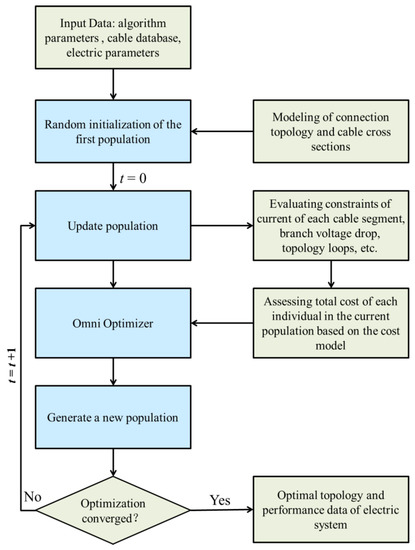 Coupled with the Omni optimizer, the connection topology and optimized framework for the wind farm power system are shown in Figure 3. The specific steps were as follows: First, the coordinates of the wind turbine group and basic parameters such as cables and algorithms were entered as the input; the variables of the connection topology and cable cross section were coded; the initial population was randomly generated, and the power parameters of the generated topology were analyzed to obtain the values of the optimization target and the constraints; and the Omni optimizer’s crossover, mutation, and elite preservation operations were performed to generate new population. Finally, the convergence was judged; if it converged, the result of the optimization was an output; if there was no convergence, the population was updated and the optimization operation of t + 1 generation was carried out.